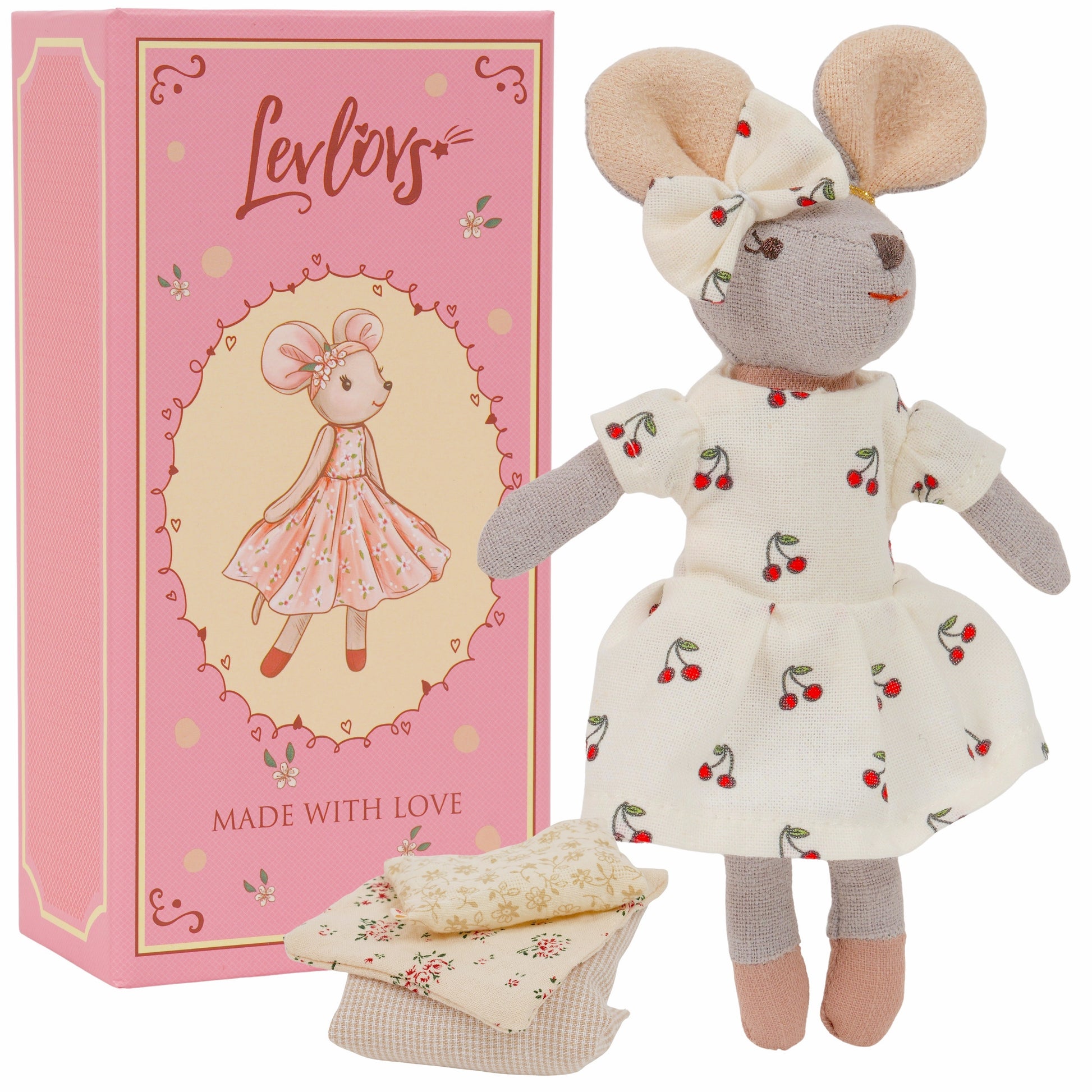 Meet our sweetest little mouse, dressed in a creamy white cherry-print dress and matching bow! Tucked cozily in her floral bedding inside a keepsake story box that reads “Made With Love,” she’s ready for cuddles, storytelling, and dreamy adventures.